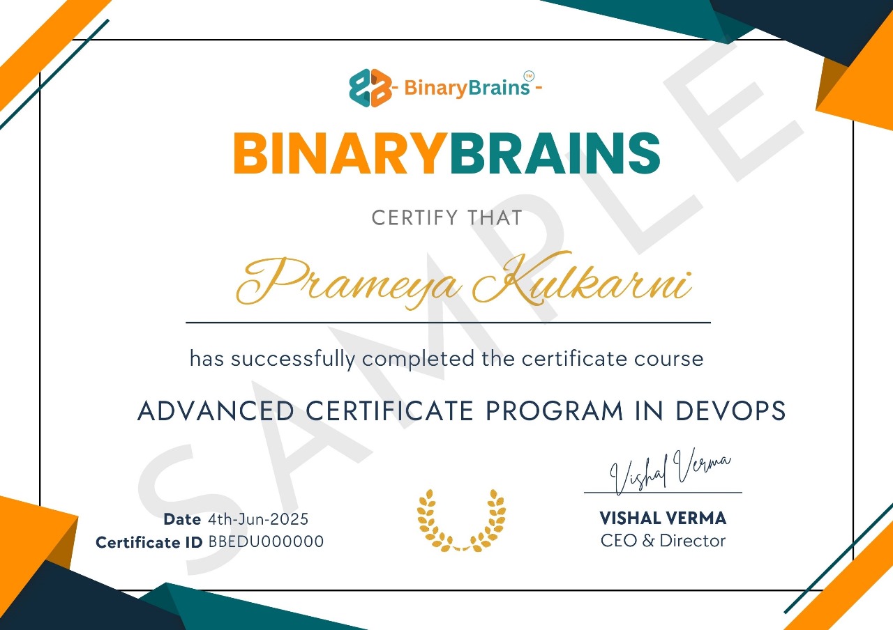 The DevOps advance certificate program at BinaryBrains is designed to provide you with in-depth knowledge and hands-on experience in implementing DevOps practices.
